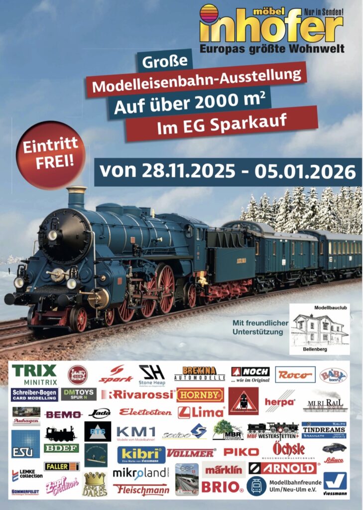 Bald ist es wieder soweit, in der Weihnachtszeit findet ab dem 28.11.2025 wieder die Modellbahnausstellung im Möbelhaus Inhofer statt.